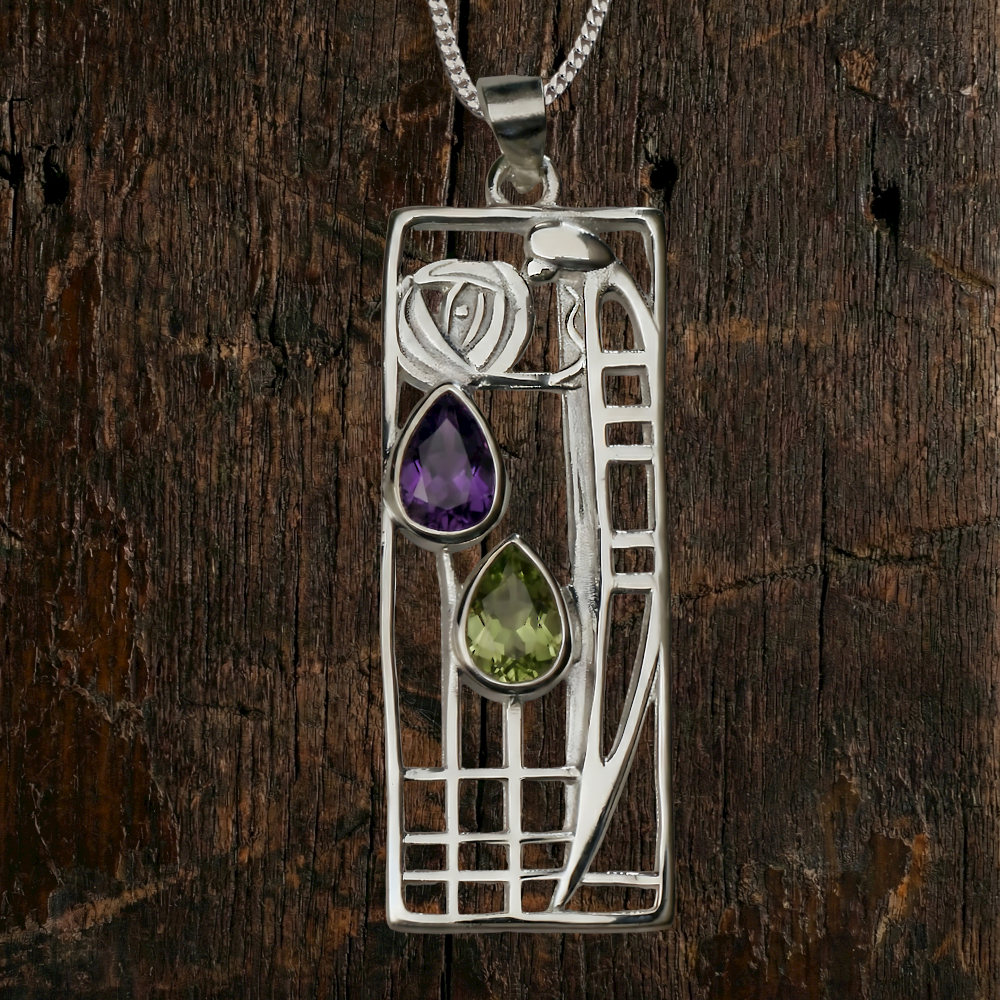 Charles Rennie Mackintosh pendant “Lover”. Sterling silver. Amethyst & peridot.