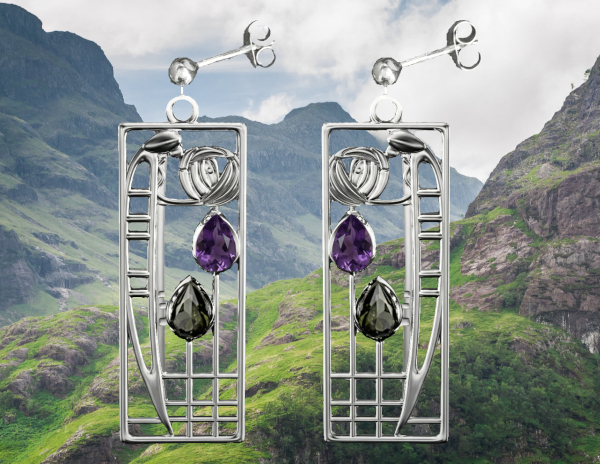 Charles Rennie Mackintosh earrings “Lover”. Sterling silver. Amethysts & peridots.