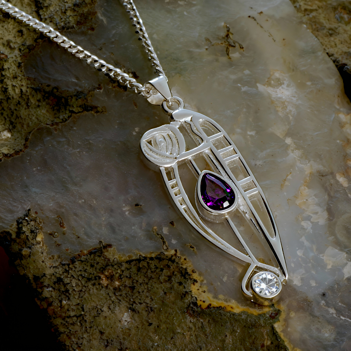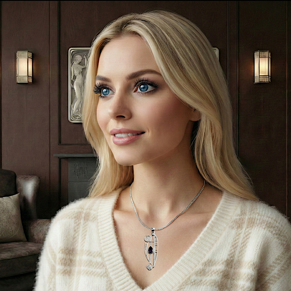 Charles Rennie Mackintosh pendant “Catherine”. Sterling silver. Amethyst & cubic zirconia.