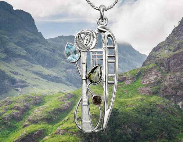 Charles Rennie Mackintosh pendant “Nairn”. Sterling silver. Aquamarine, peridot & smoky quartz (cairngorm).