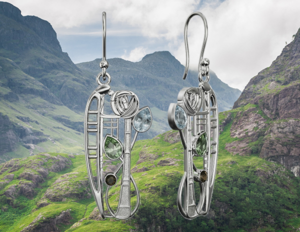 Charles Rennie Mackintosh earrings “Nairn”. Sterling silver. Aquamarine, peridot & smoky quartz (cairngorm).