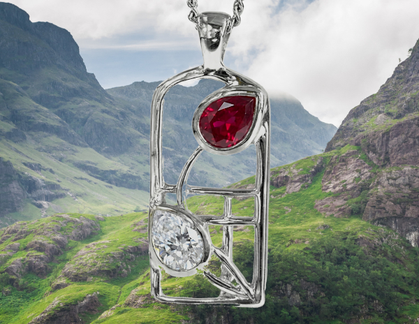 Charles Rennie Mackintosh pendant “Valentine”. Sterling silver. Ruby & cubic zirconia.