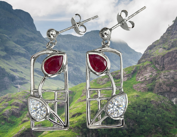 Charles Rennie Mackintosh earrings “Valentine”. Sterling silver. Ruby & cubic zirconias.