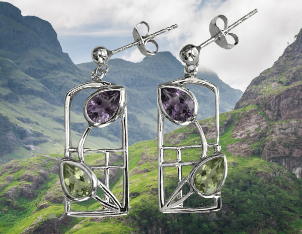 Charles Rennie Mackintosh earrings “Dern”. Sterling silver. Amethysts & peridots.