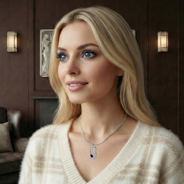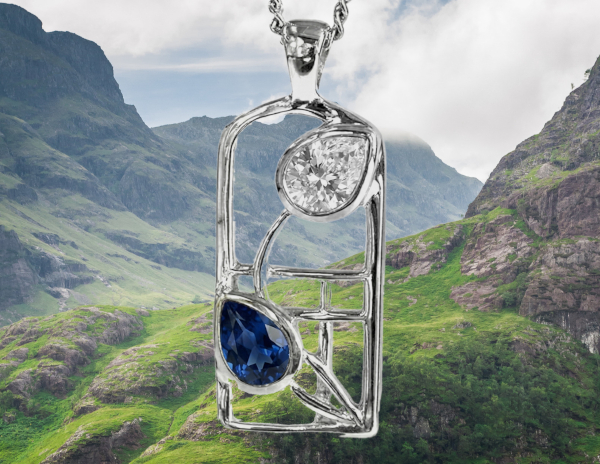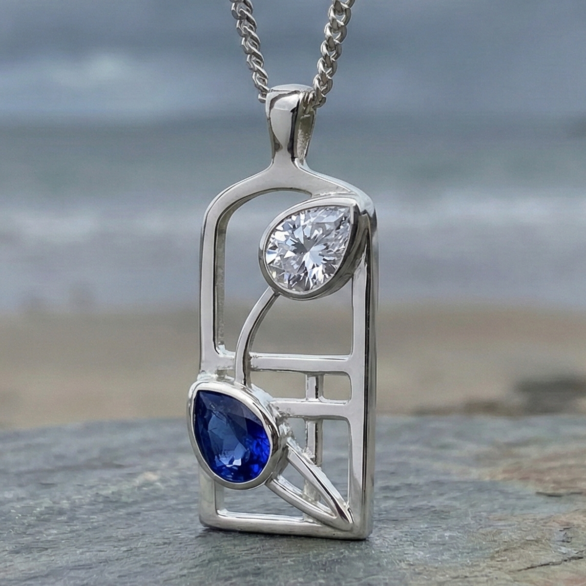 Charles Rennie Mackintosh pendant “Saltire”. Sterling silver. Royal blue sapphire & cubic zirconia.