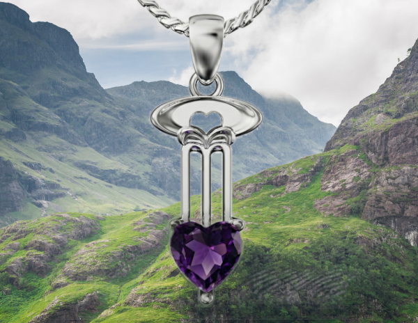 Charles Rennie Mackintosh pendant “Dunure”. Sterling silver. Heart cut amethyst.