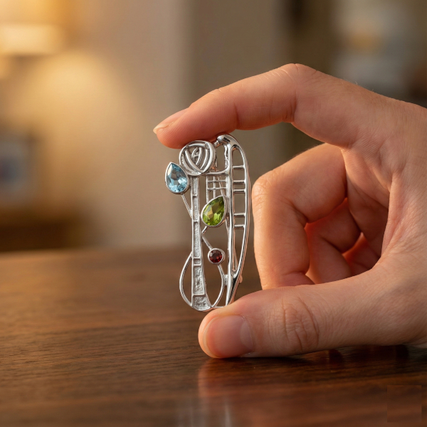 Charles Rennie Mackintosh brooch “Nairn”. Sterling silver. Set with Aquamarine, Peridot & Smoky Quartz (Cairngorm).