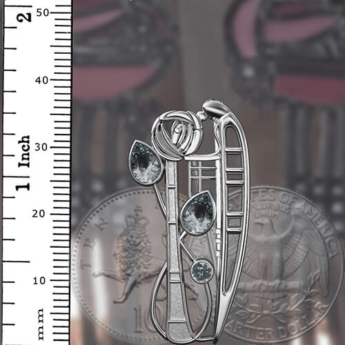 Charles Rennie Mackintosh brooch “Nairn”. Sterling silver. Set with Aquamarines.