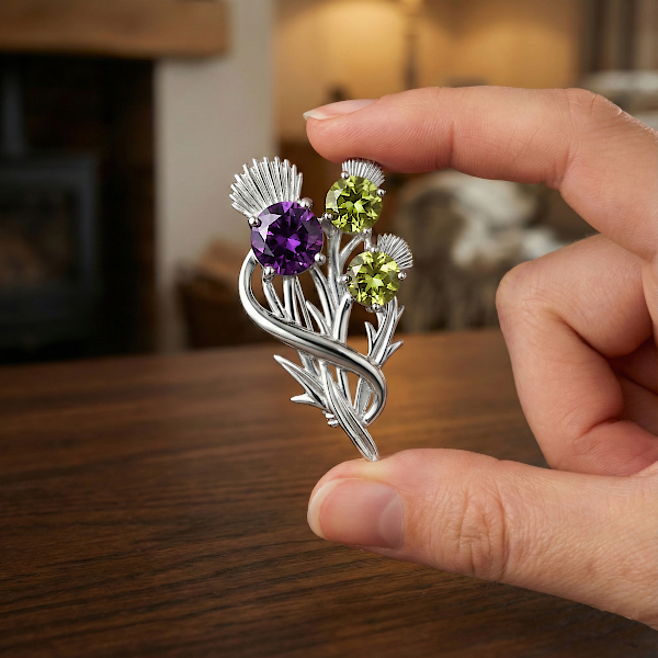 Scottish thistle brooch with amethyst & peridots “Croy”. Sterling Silver.