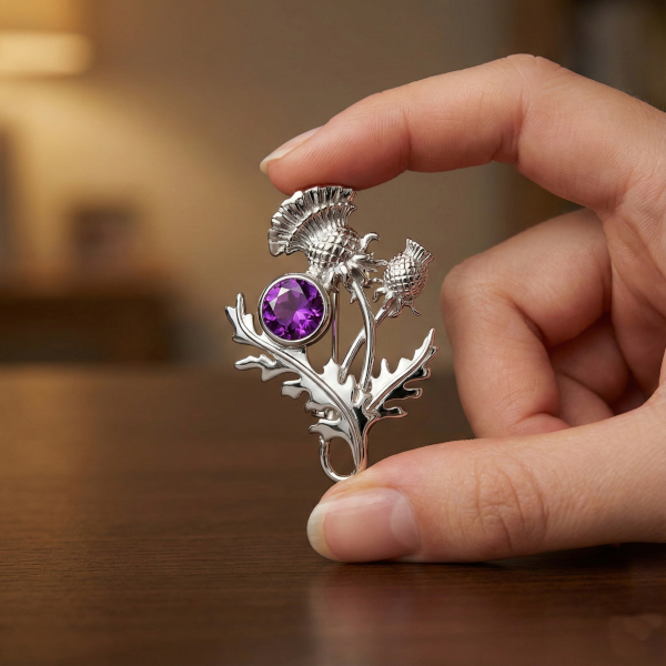 Scottish thistle brooch with amethyst “Ross”. Sterling Silver.