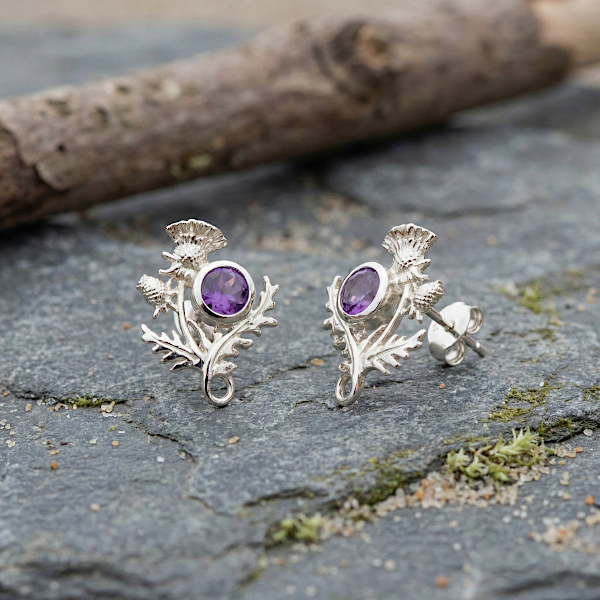 Scottish thistle earrings with amethysts “Ross”. Sterling Silver.